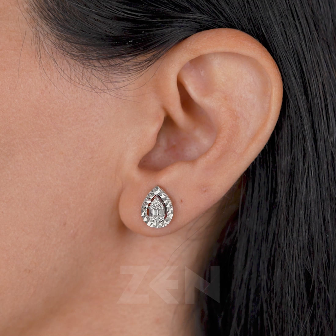 The Design Diamond Stud Earrings by Zen Diamond showcase refined elegance and expert craftsmanship. Handcrafted from approximately 3.00 g of 8K white gold, each earring features a total of 26 diamonds with a combined weight of 0.22 ct. A sophisticated arrangement of trapezoid and round-cut diamonds, all G color and VS/SI clarity, creates a subtle yet dazzling sparkle. Perfect for everyday wear or special occasions, these stud earrings are available in white, yellow, and rose gold, each metal option highlighting a unique character. Every pair comes with a certificate of authenticity, premium packaging, and a personalized greeting card.